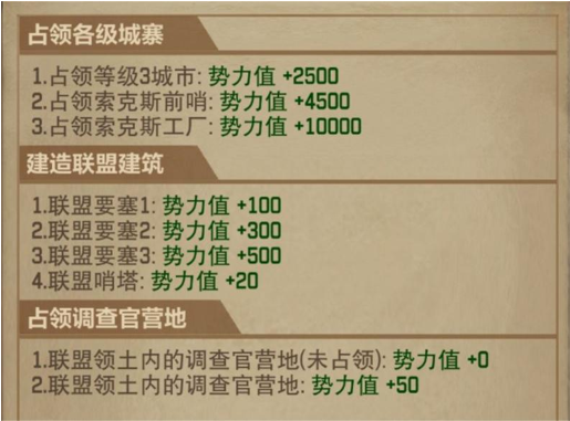 上面介绍了在玩法中的各类建筑,但调查官们一定要明确我们的绝对目标是要让自己的联盟获取更多的势力值。