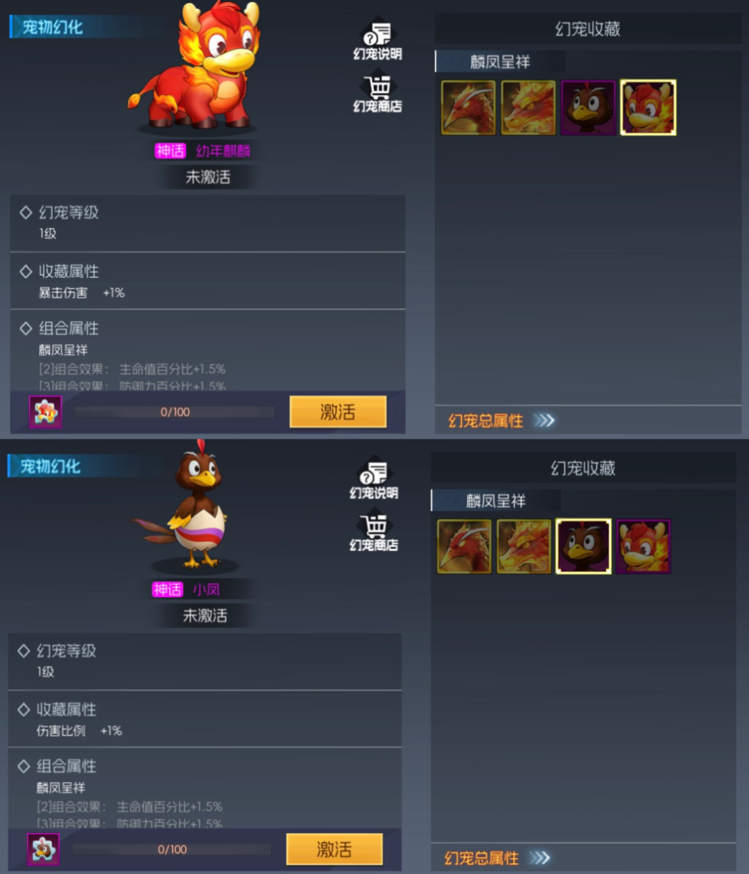 激活并升级幻宠,即可提升专属收藏属性。若能集齐“麒麟”与“凤凰”,更能触发【麟凤呈祥】稀有组合效果,得祥瑞庇佑,享属性加成!让这些经典身影,陪伴我们一同闯荡恐龙世界吧!