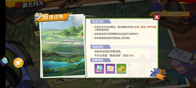 在活动期间,每天随机事件在主城、家园、世界地图上出现挑战怪,击败挑战怪可获得随机纪念品碎片、明信片,每日可免费挑战3次,购买挑战3次。挑战怪分简单、普通、困难:简单挑战怪掉落10张明信片、10个纪念品碎片随机箱;普通挑战怪掉落15张明信片、15个纪念品碎片随机箱;困难挑战怪掉落20张明信片、20个纪念品碎片随机箱。