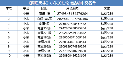 以下为本次关注论坛活动的获奖楼楼,钻石礼包我们将于24小时之后发放到您的角色中,由于参与人数较少,小秘书选取了部分玩家哦,最后小秘书祝各位老板在游戏中早日当上首富,作用极品秘书