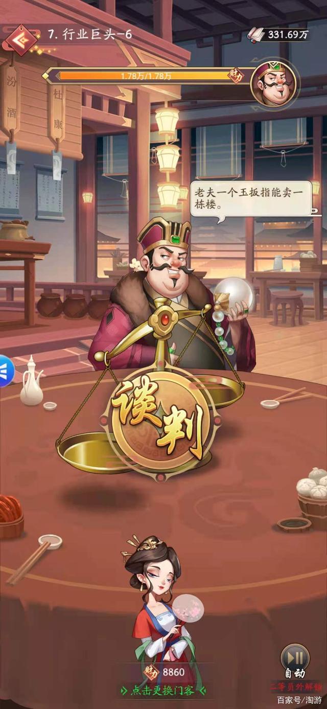 除了让人意外的游历玩法外,主角的扩张手段采取嘴炮战斗也是让笔者万没想到的。在《我是大东家》中运用谈判这种方式替代了一般的战斗系统,玩家只需要熟练应用嘴炮伎俩赢过对手店面的所有人,就能成为"嘴强王者",哦不,就能用钱狠狠砸到那老板脸上,告诉他"从此这店就是我的了,你要么从我眼前消失,要么成为我的仆人"后转身离去。