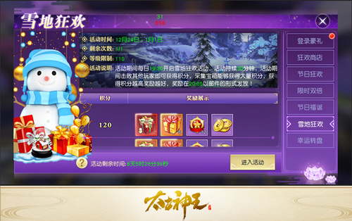 除了登录礼包外,双旦期间玩家参加游戏内各类活动还可赚取狂欢值和节日勋章,积累狂欢值可以解锁五大节日礼包,开启后获得元宝、高阶兽魂、元旦专属称号等多重奖励。而节日勋章可以用于节日商店兑换多种珍稀道具,高阶合成素材“神品玄玉”,元旦配饰礼包,
