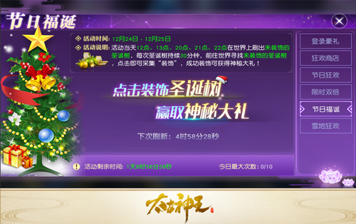 作为冬季节日,说到圣诞节就很难让人不想到雪和圣诞树,那么要不要试试在异界仙域亲手装扮圣诞树的奇妙乐趣呢?12月24日和12月25日两天,游戏会在固定时段随机刷出未装饰的圣诞树,而玩家要做的就是找到这些圣诞树并为它们挂上好看的装饰,当然圣诞树也会回赠神秘大礼哦。