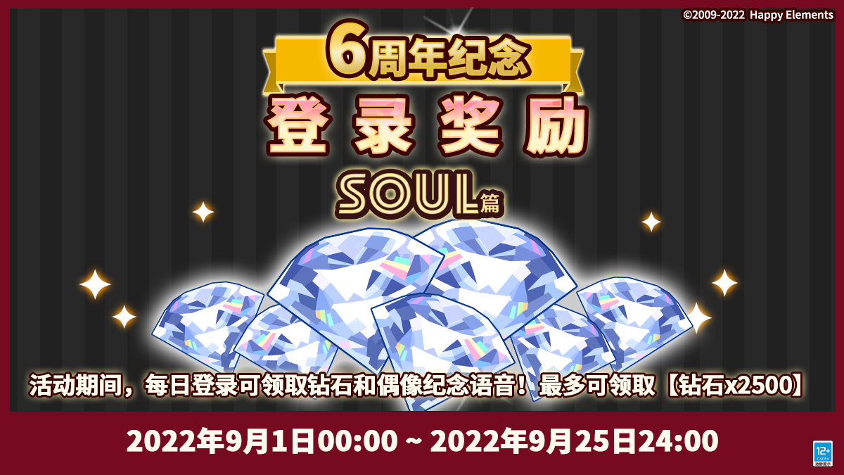 活动期间,每日登录游戏可领取钻石和SOUL篇出场的偶像们及佐贺美阵、门章臣6周年纪念语音,钻石最多可领取2500钻!