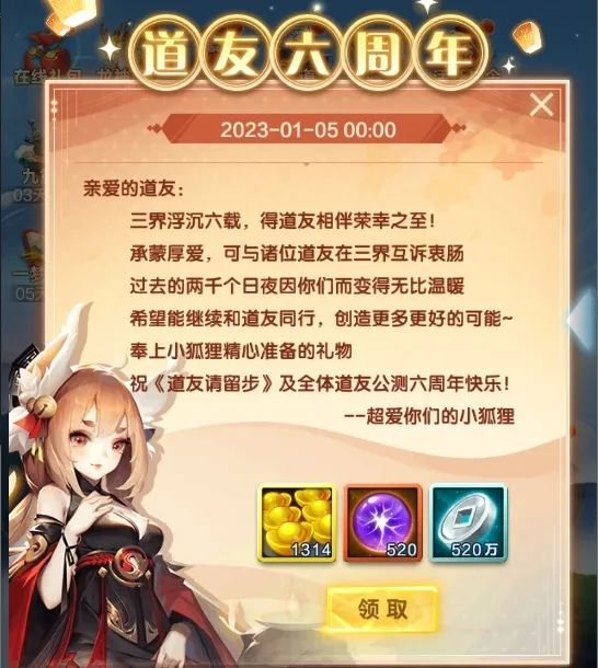 小狐狸还藏了1314元宝在游戏内的感谢信里,『道友请留步』公测6周年这个大日子,别忘了登录游戏,相约三界一起庆祝呀!