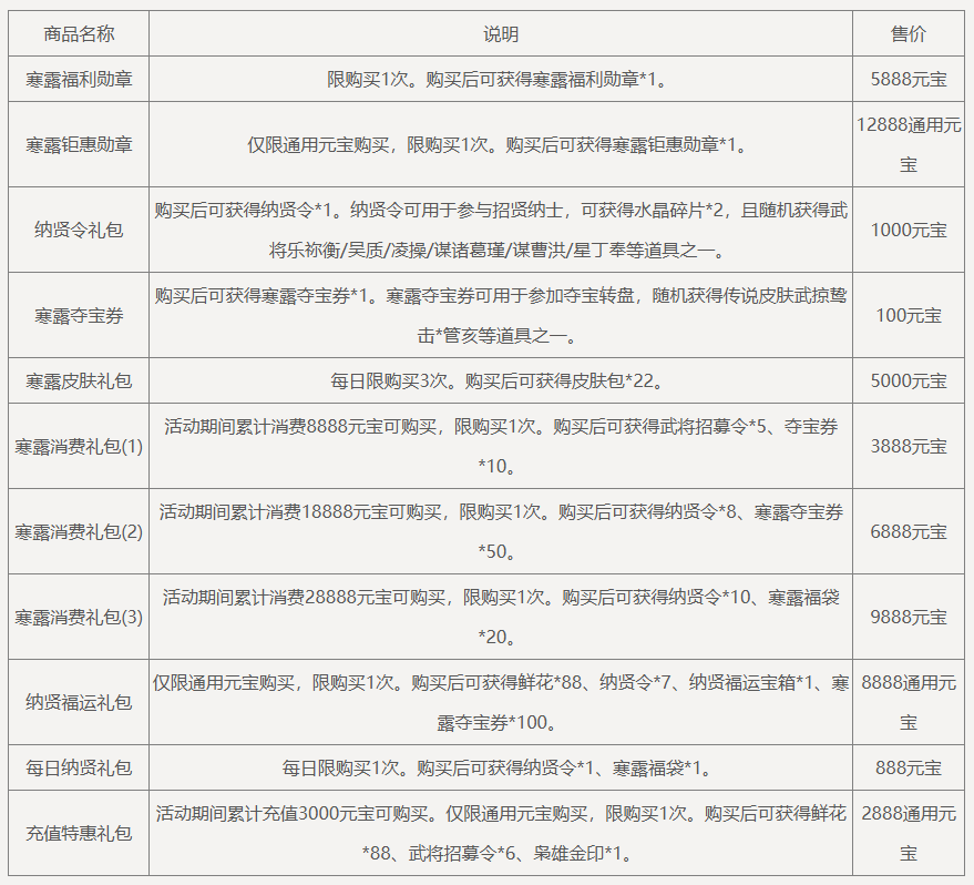 累计充值12888元宝,可领取奖励:寒露红包*2,纳贤令*2,限完成1次。