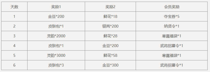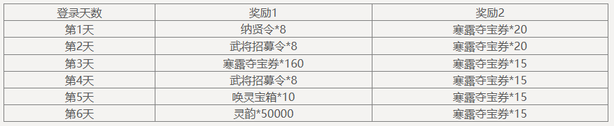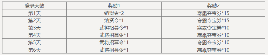 单笔充值6000元宝,可领取奖励:纳贤令*6、武将招募令*6、寒露夺宝券*60,3选1,每日限完成1次。