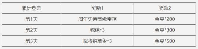 每日充值达到3000元宝,可领取奖励:武将招募令*2、锦绣*4、冬至夺宝券*20,3选1,每日限完成1次。