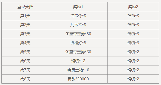 仅限12/21,当日登录,可领取:寒梅*5,冬至夺宝券*10,限完成1次。