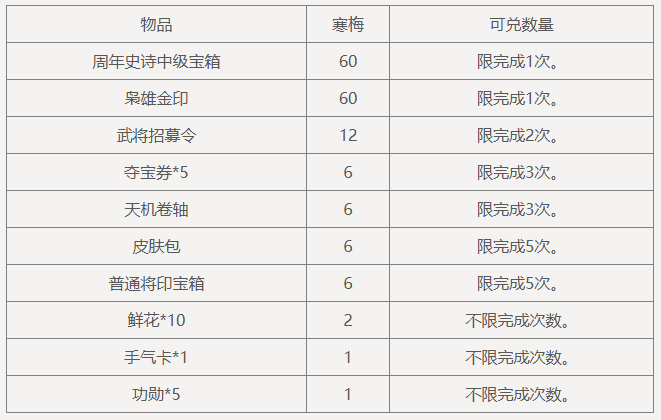 消耗寒梅前往兑换商店兑换将史诗皮肤自选宝箱、枭雄金印、皮肤包等丰富奖励!