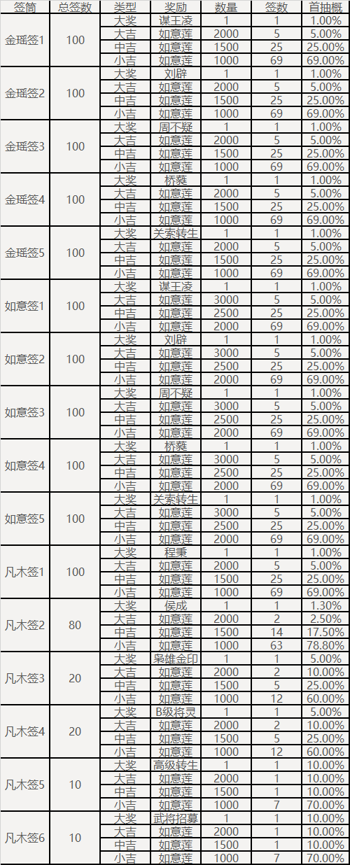 2、每种签筒中拥有1支大奖签与若干支普通签,抽到大奖签必定获得对应签筒内大奖道具,抽到普通签根据签的大吉、中吉、小吉获得对应数量如意莲。