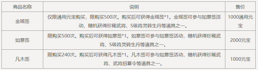 1、玩家可使用金瑶签、如意签、凡木签分别在对应签筒中进行抽签,每种签筒所消耗签种与数量各有不同,玩家可选择自己心仪大奖的签筒进行抽签。