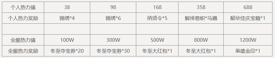 单笔充值6000元宝,可领取奖励:纳贤令*6、锦绣*12、冬至夺宝券*60,3选1,每日限完成1次。