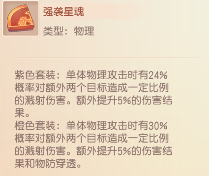 此星魂特别难出产,只有一些活动可以弄到手,这个是比压制更适合金刚,你想,一刀下去暴击一万二作为例子,强袭的溅射伤害为6000,而且是固伤!而且是两个目标!等于一刀输出了两万四的伤害!