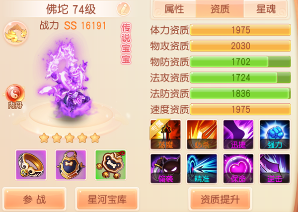 从天赋技能来看呢,可以看得出金刚是一只单体物理型宝宝。有几个关键词得get到,“临时提高自身5%的暴击”,“攻击敌方一个目标”,“自身物攻高出目标物攻越多,则伤害结果越高,反之越少”。好,从这几个关键词来看,首先这天赋技能是个主动技能,所以这不是一只隐攻宝宝,其次,这只宝宝必须打必杀,有条件的超级必杀一定得打,最后,这是一只专打辅助和法师的宝宝!(当然拉,打法宠什么的也是杠杠的)如图:
