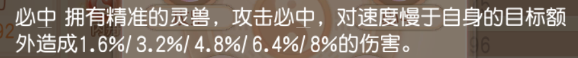 大家疑惑的精准来了,看仔细了,对速度慢于自身的目标额外造成8%的伤害,要暴力就选他,get!