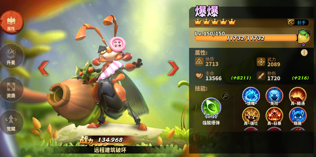 爆爆的拿手技能就是“强酸炮弹”。爆爆始终处于超远程攻击模式,攻速较低但是拥有超远的射程。每次普攻向目标发射一枚炮弹,战斗时每次普攻向目标发射一枚炮弹,对目标造成自身攻击力的范围伤害,优先锁定防御建筑。