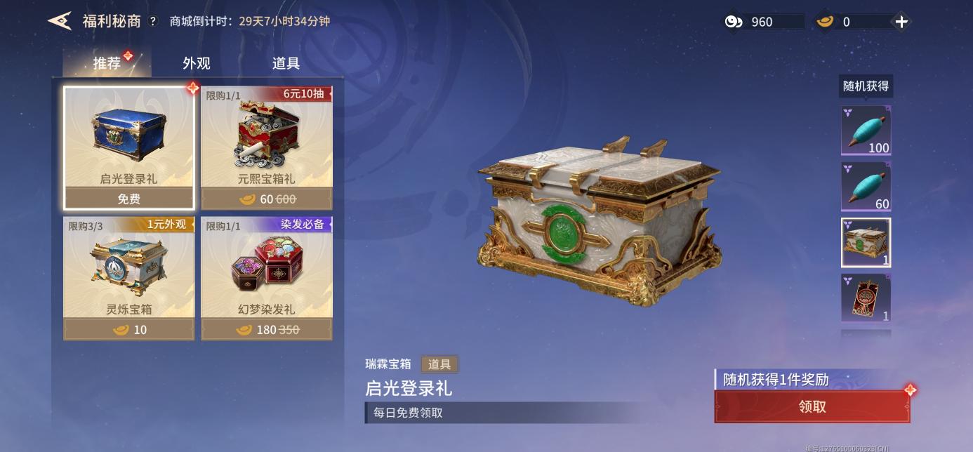从主页进入初入永劫,再进入福利秘商,每日免费领取的启光登录礼有概率获得瑞霖宝箱,仅售60元宝的元熙宝箱礼可获得10个瑞霖宝箱。