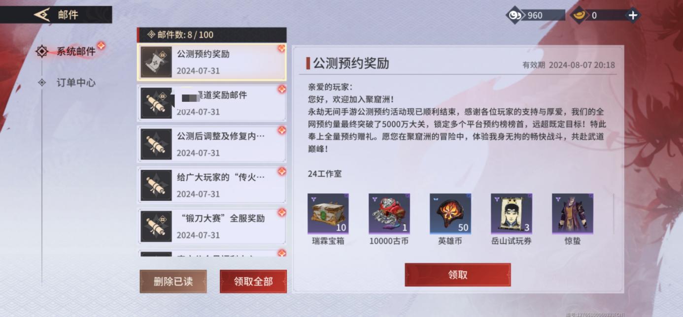 登录并进行一局游戏可在主页右上角其他中进入邮件,领取预约奖励,含10个瑞霖宝箱!