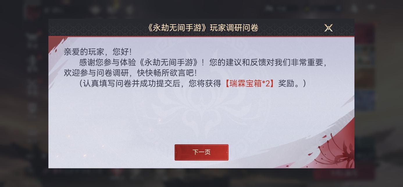 在主页点击问卷,填写玩家调研问卷,可获得2个瑞霖宝箱。