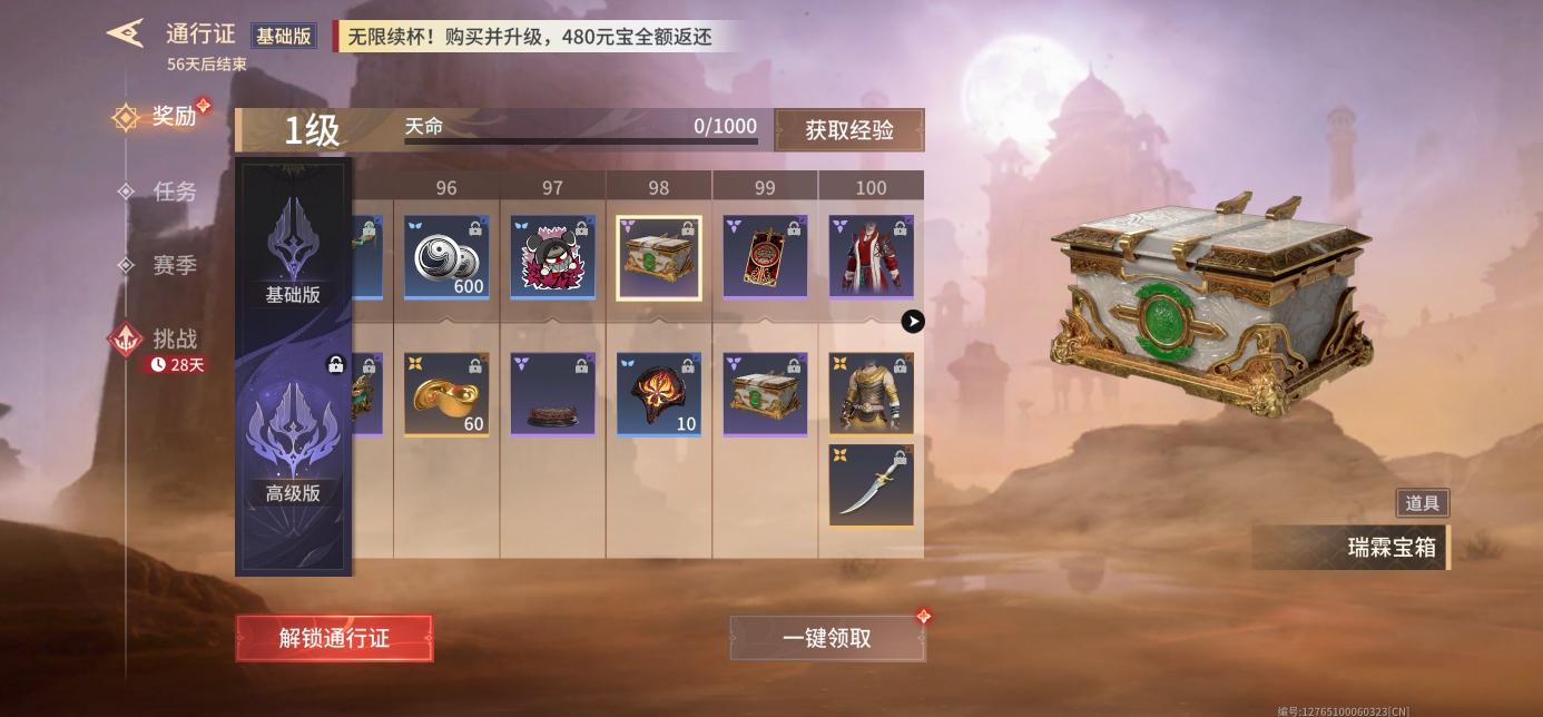 从主页进入天命通行证,通行证基础版可获得10个瑞霖宝箱,进阶后可获得更多宝箱。