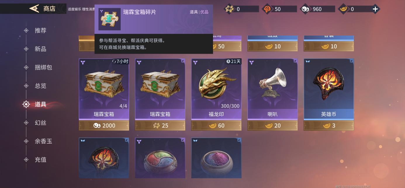 从主页进入商店,道具类别中,可以使用瑞霖宝箱碎片或古币兑换瑞霖宝箱。