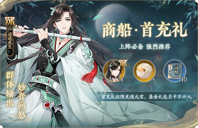 首充活动:首次充值任意金额元宝即可获得SSR【逍遥先生】【花诏令*5】以及升级道具(礼包月卡不计入)