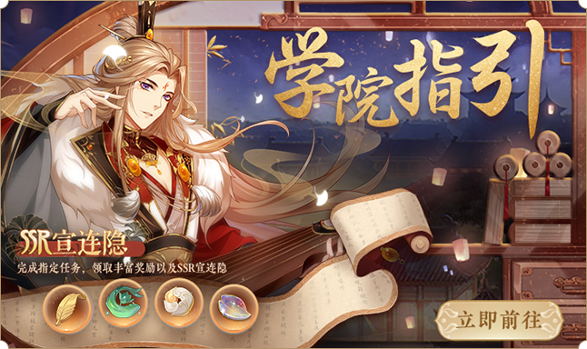 测试期间完成学院指引,可获得SSR名士【宣连隐】【花诏令*13】以及其他游戏内资源奖励