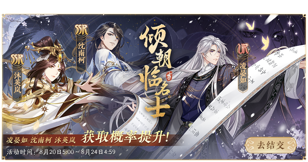 限定up卡池:8月20日05:00-8月24日04:59开放限定up卡池“倾朝临名士”,活动期间前十次抽卡必得SSR,获得名士凌晏如、沈南柯、沐英岚的概率将提升。
