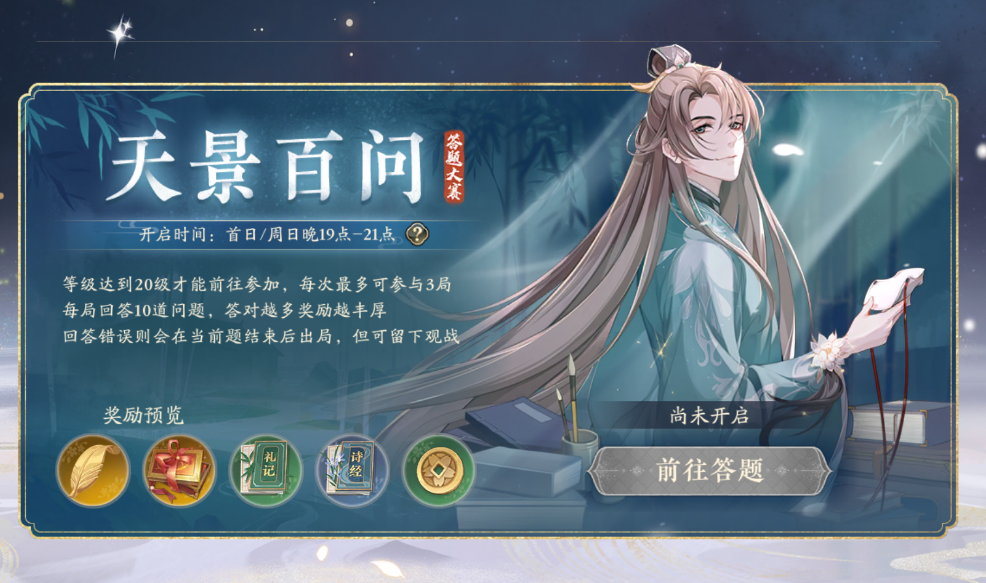 测试首日(8月18日)及每周日(8月22日、8月29日)19:00-20:00将开启答题大赛,通过活动可获得宝箱、金叶子、养成材料等奖励。