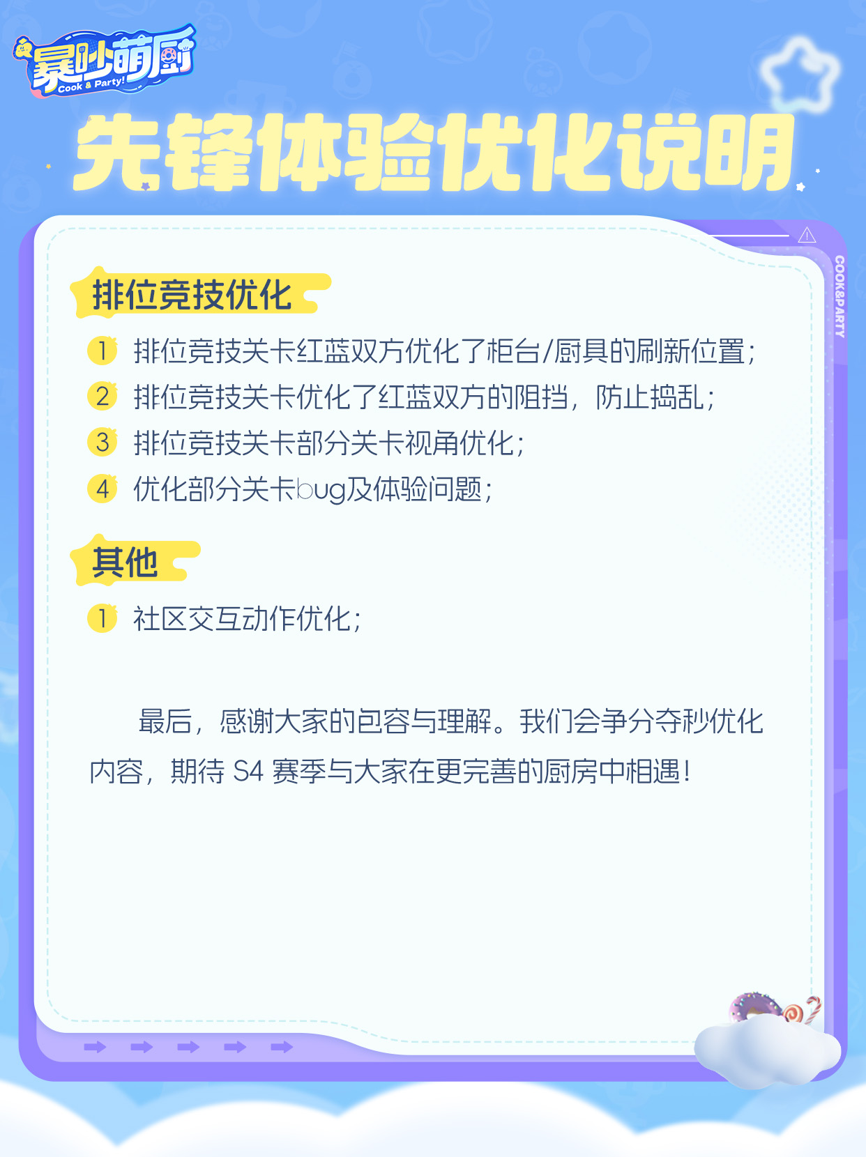 最后,感谢大家的包容与理解。我们会争分夺秒优化内容,期待S4赛季与大家在更完善的厨房中相遇!