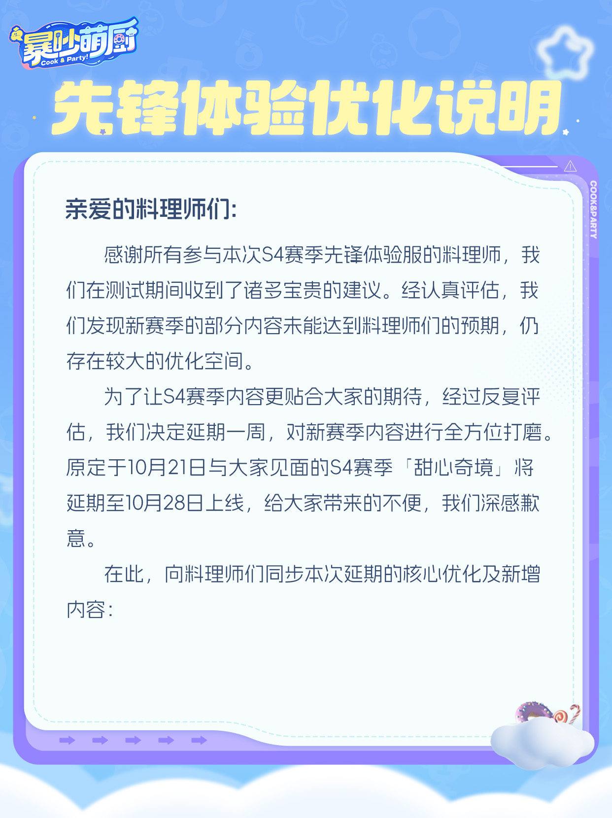 原定于10月21日与大家见面的S4赛季「甜心奇境」将延期至10月28日上线,给大家带来的不便,我们深感歉意。