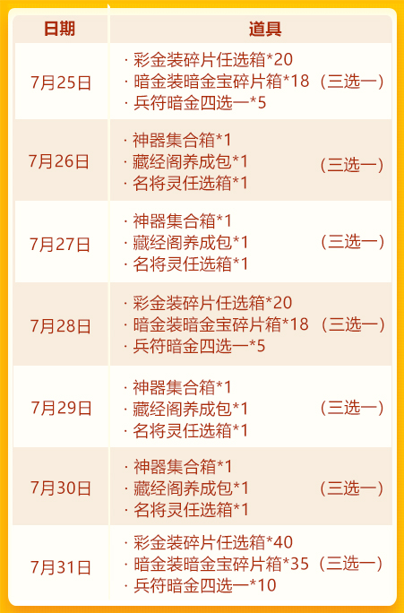 更能拿到丰厚的彩金装碎片任选箱、暗金装暗金宝碎片箱、兵符暗金四选一、神器集合箱、藏经阁养成包、名将灵任选箱等资源哦~