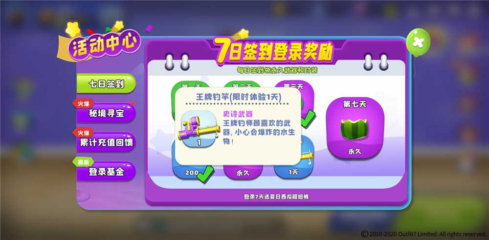 第六天是史诗级武器!王牌钓竿!听这名字钓竿感觉不是很牛,但是王牌!是王牌钓师最喜欢用的武器,小心会爆炸的水生物!但是限时一天,好好体验!