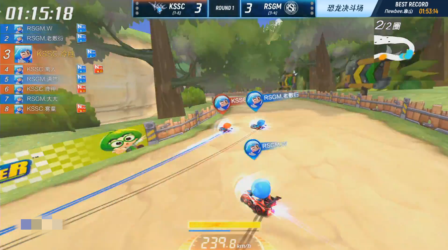 第三场比赛由KSSC对战RSGM,在团队竞速赛的“恐龙角斗场”地图中,RSGM在拿到抢跑优势之后,KSSC通过在捷径点发起的一波对抗迅速进行反抢。来到第二圈恐龙蛋路段,KSSC.冷月发起一波冲击,利用贴内壁拖漂抢到位置之后,再断漂调节氮气,稳稳贴在领跑车尾。冲线时刻,KSSC.鹿神率先爆发尾流抢到第一,但老谋深算的RSGM.老敷衍让出第一位置的瞬间再次吸住KSSC.鹿神尾流,完成极限反超。结果在团队竞速赛中,双方战满7局,但RSGM发挥更稳定,先下一城。团队道具赛上,双方你追我赶,再次战满7局,决胜局中,KSSC.鹿神在冲刺时使用盾挡住对方飞弹,率先冲线,拿下决胜局,扳回一分。个人竞速赛上,双方各胜一局,决胜局RSGM.老敷衍极其稳健,拿到胜利。最终RSGM以2:1的比分战胜KSSC。