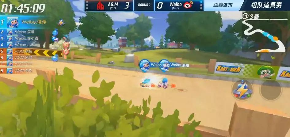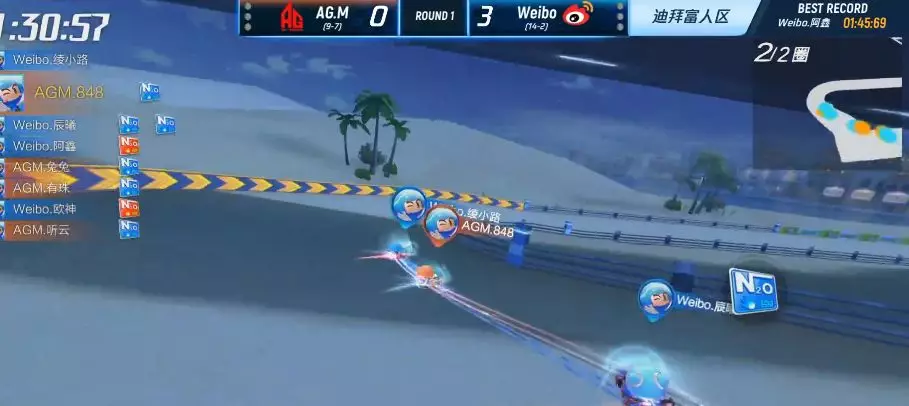 而在团队道具赛上,Weibo战队在整个常规赛的表现中,团队道具赛的胜率都非常低,包括上周和AG.M的对战中,也一度被AG.M打得毫无还手之力。反观AG.M,团队道具赛则算是他们的秘密武器了。在个人竞速中,AG.M.848在上周战胜了Weibo.阿鑫,尽管这不能说明AG.M.848就比Weibo.阿鑫强,但可以看出两队在个人竞速赛上的实力,其实非常接近,只要任何一方出现失误,胜利的天平就有可能倾斜。