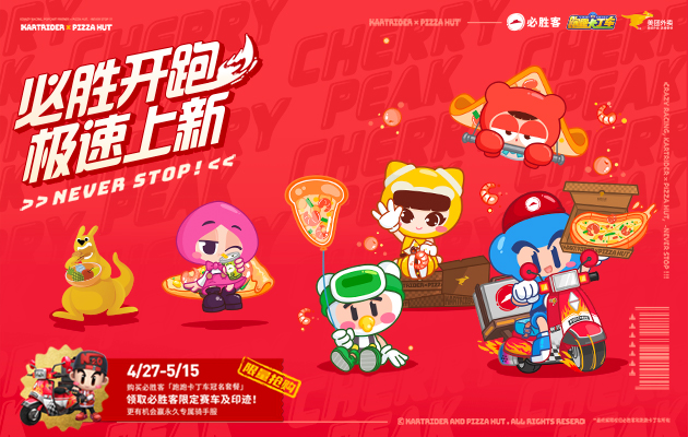 必胜开跑,极速上新!由世纪天成与腾讯合作联运的《跑跑卡丁车官方竞速版》手游燃擎归来,S5赛季火爆进行中,跑跑手游x必胜客特别联动也震撼来袭。本次强强联合,除了将在全国必胜客上架的合作主题套餐,还在深圳、广州、上海、成都和青岛特设合作主题门店。跑跑手游专属礼包、必胜客超值优惠券、跑跑精美周边等丰厚奖励惊喜放送,各位车友可千万不要错过喔!