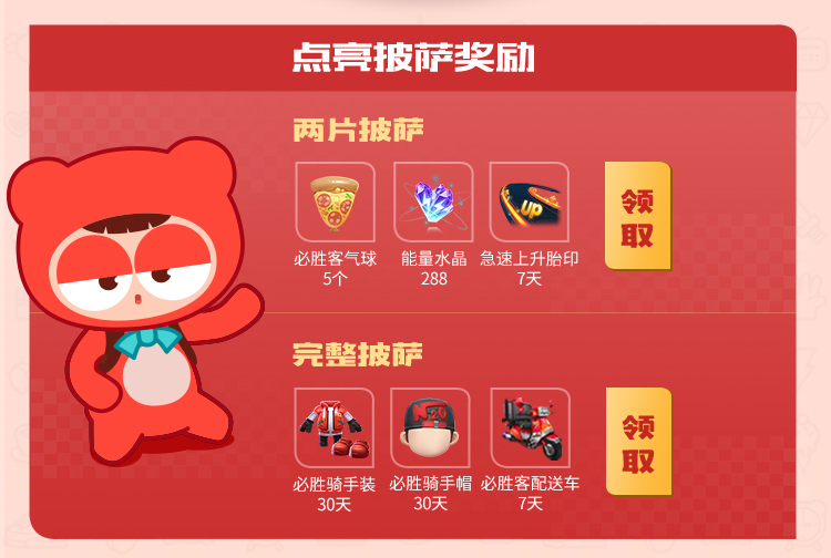 点亮两片披萨可得必胜客气球、能量水晶与疾速上升印迹;当点亮完整披萨,更有联动专属的限定必胜客套装惊喜送出喔。快准备好一起制作美味披萨,获取定制奖励吧!
