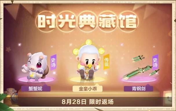 除此之外,还有黄金宝石柱、魔力图腾、黄金围墙、黄金墙角、黄金地砖、金围栏、玉石台阶、太阳神地砖、扇芭蕉等超多奢侈的小屋装扮等待车友解锁。新版本上线后,大家别忘了到小屋查看哦!时光典藏馆更新8月28日起,时光典藏馆将迎来新一期的典藏资源。金童小乖、青钢剑、蟹蟹妮等一系列的人气物品,将再度登场时光典藏馆。