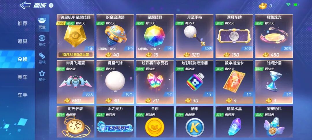 元宝商城兑换全面刷新,精品配饰月兔炫光、奔月飞翔翼、月至手持、满月车牌、月至气球等你兑换,金秋丰饶有月相伴,还有心愿结晶、炽金启动器等好物别错过!