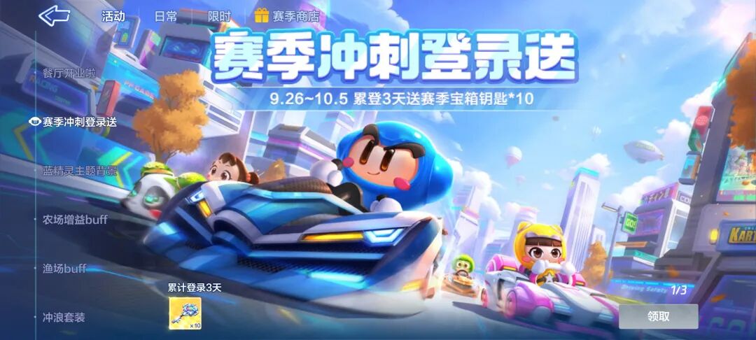 开着心爱的小赛车,在新赛季猛猛冲刺,开宝箱上大分。9月26日起,累计登录3日即可免费领10个赛季宝箱钥匙!