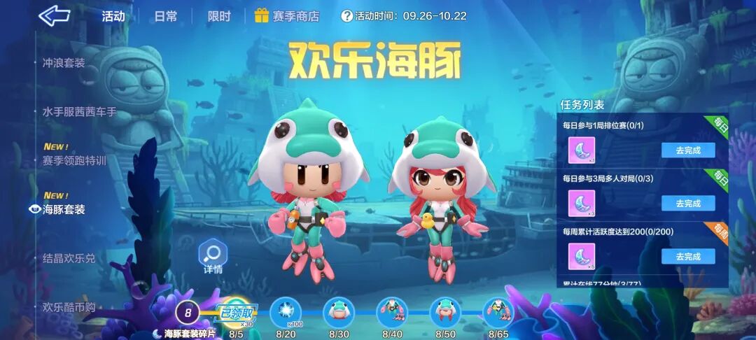 亲近海洋与自然,化身海豚拥抱这片蔚蓝。9月26日起,每日完成任务,免费领取海豚套装,做一只无忧无虑的快乐小海豚~