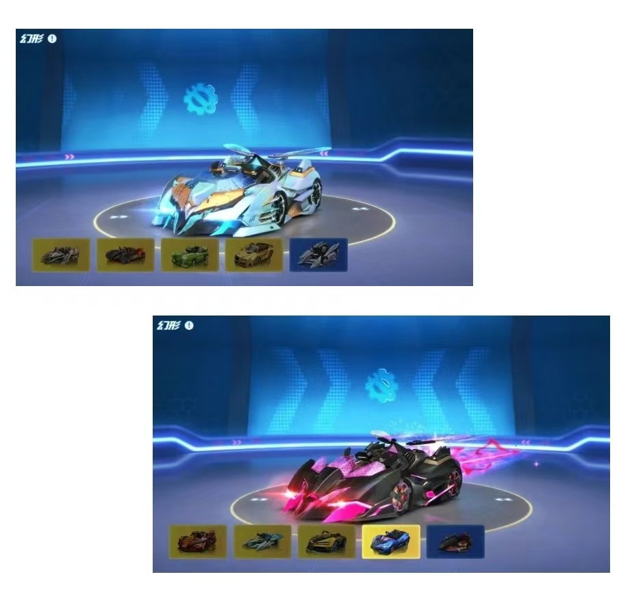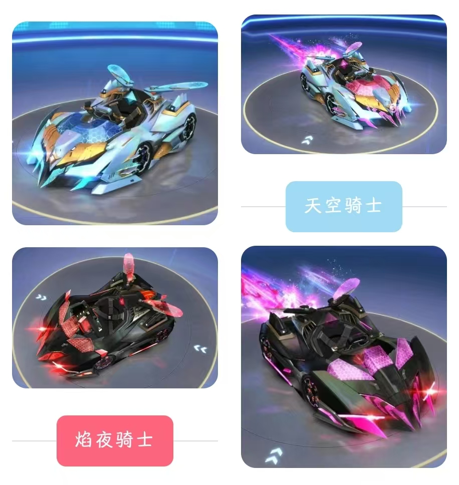 拥有【天空/焰夜骑士】任意一辆的车友们,可在仓库界面为新车幻形,每辆的可幻形赛车不同,每辆车都可幻形5辆赛车,拥有两辆车,就能畅玩12辆不同赛车!