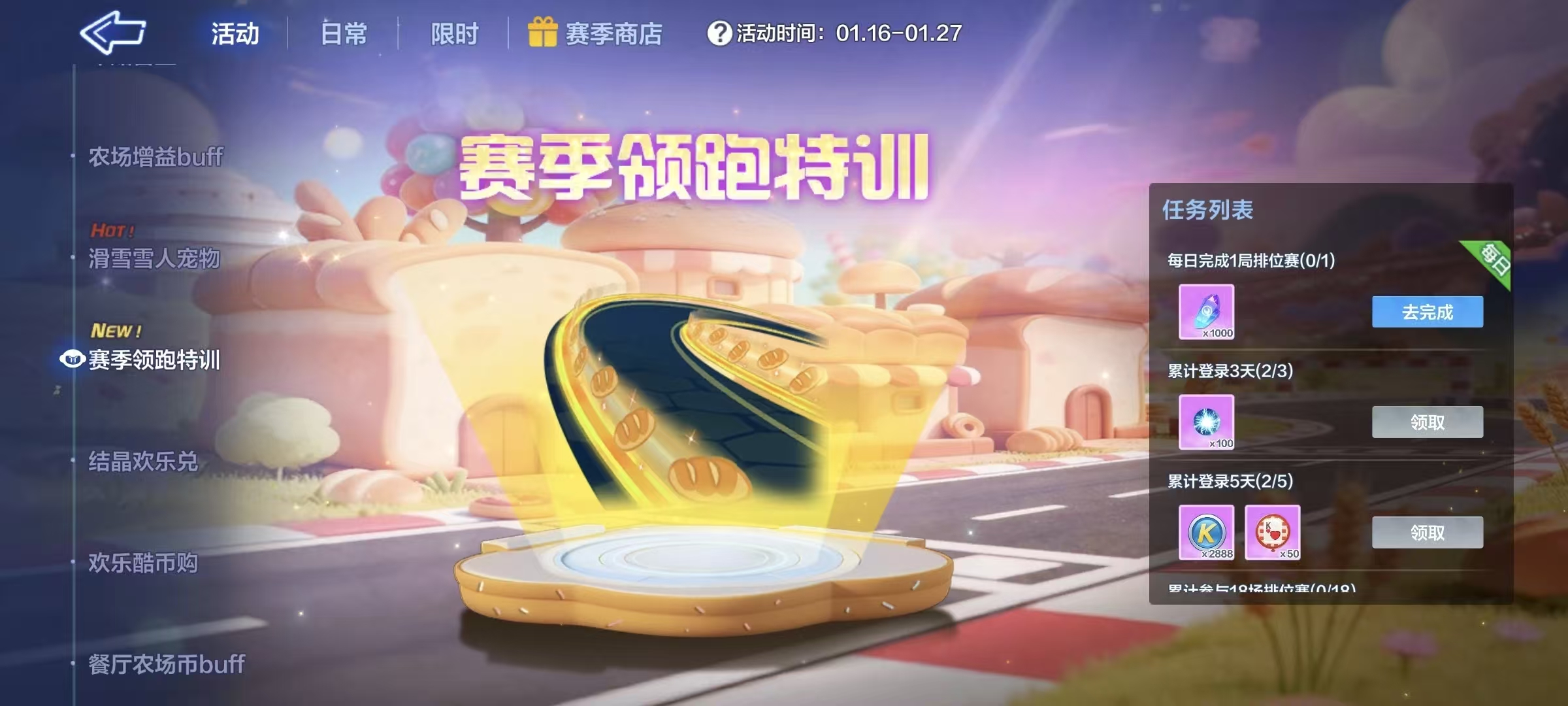 丰收的光芒降临赛道,寄予每个人柔软香甜的小面包!1月16日起,新赛季领跑特训活动开启,每日登录&参与排位,【面包印迹】等精品好礼就等你来!