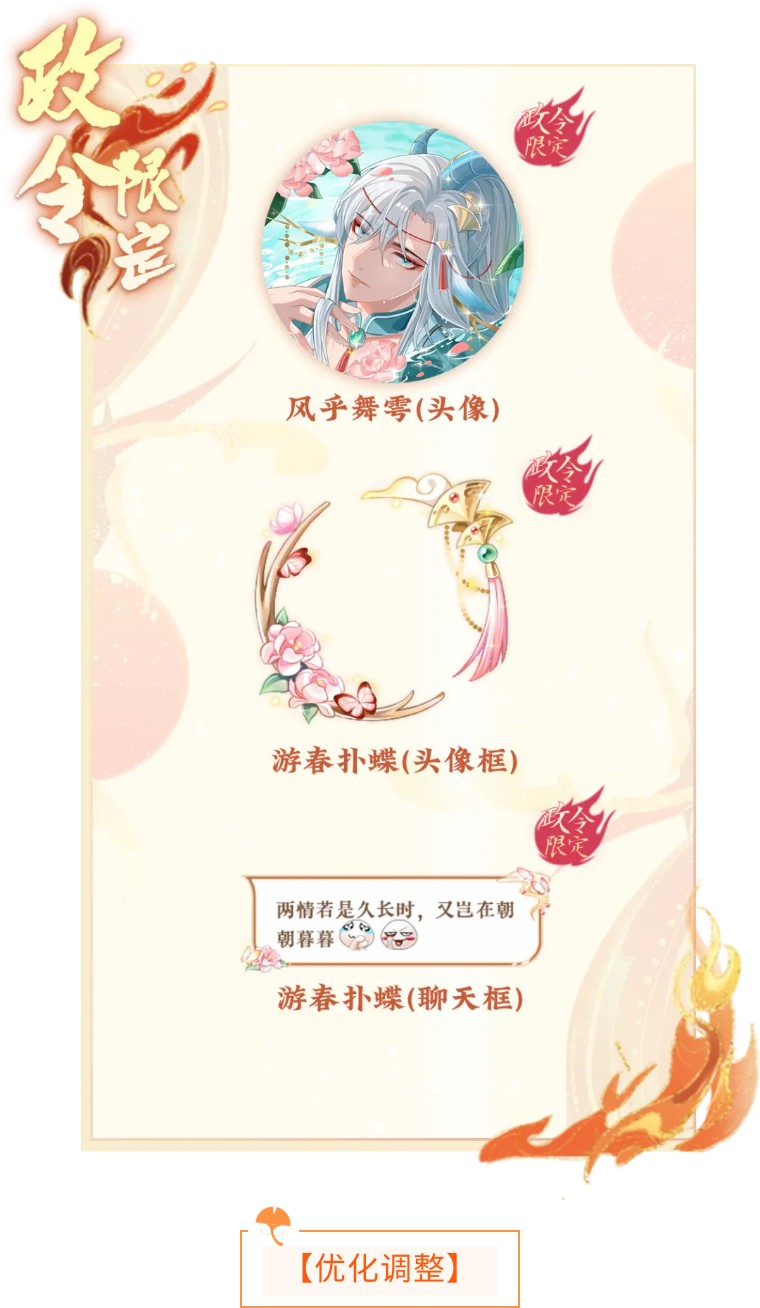 新的一期上凰政令将于4月25日0:00开启,提升政令等级,购买进阶方案,有机会获得全新头像“风乎舞雩”、头像框/气泡框“游春扑蝶”