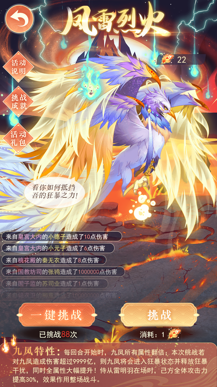 5、每次挑战最多总共5回合,九凤伤害无视巴利王锁血效果和不死技能效果;每回合开始时,九凤所有属性翻倍;本次挑战若对九凤造成伤害超过9999亿,则九凤会进入狂暴状态并释放狂暴干扰,全属性大幅提升