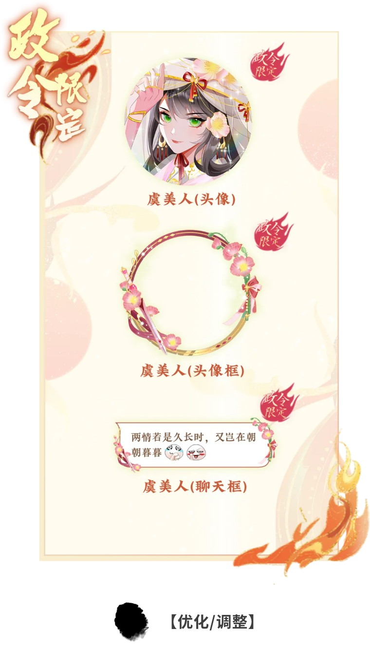 新的一期上凰政令将于6月20日0:00开启,提升政令等级,购买进阶方案,有机会获得全新头像/头像框/气泡框“虞美人”