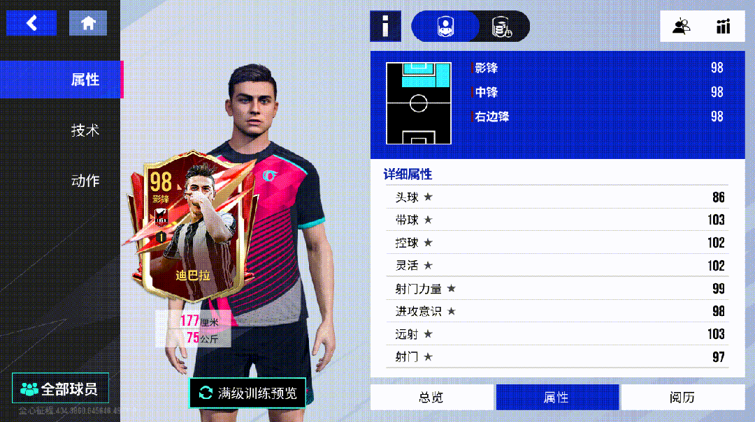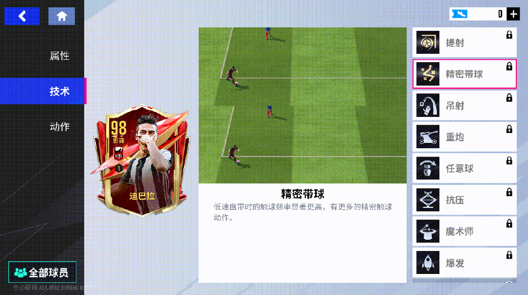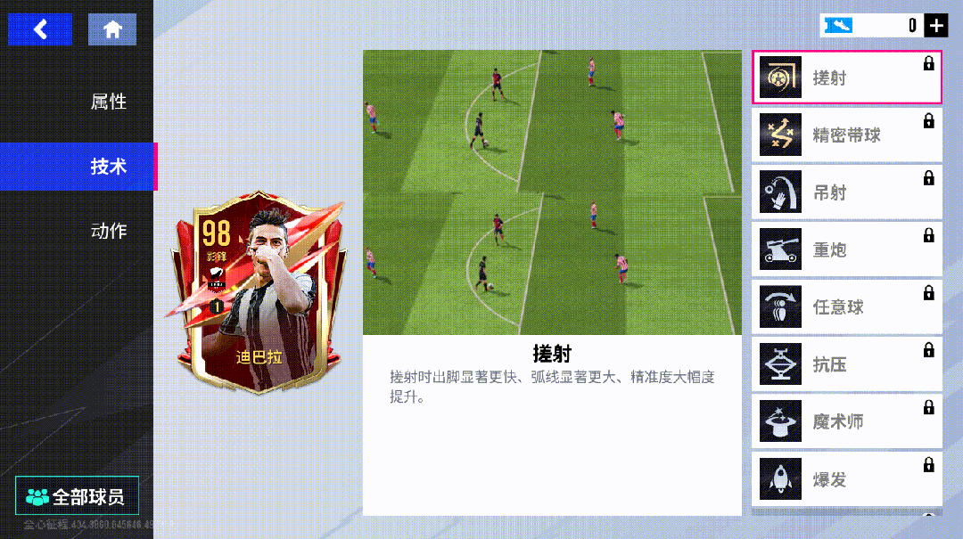 迪巴拉搭载了金色技术【搓射】【精密带球】,助其面对对方包围时如入无人之境,再以一脚完美的弧线球完成得分。不仅如此,【吊射】【重炮】【任意球】【抗压】【魔术师】【爆发】等技术进一步丰富了迪巴拉的进攻武器库,让他成为了一个无坚不摧的前场多面手!