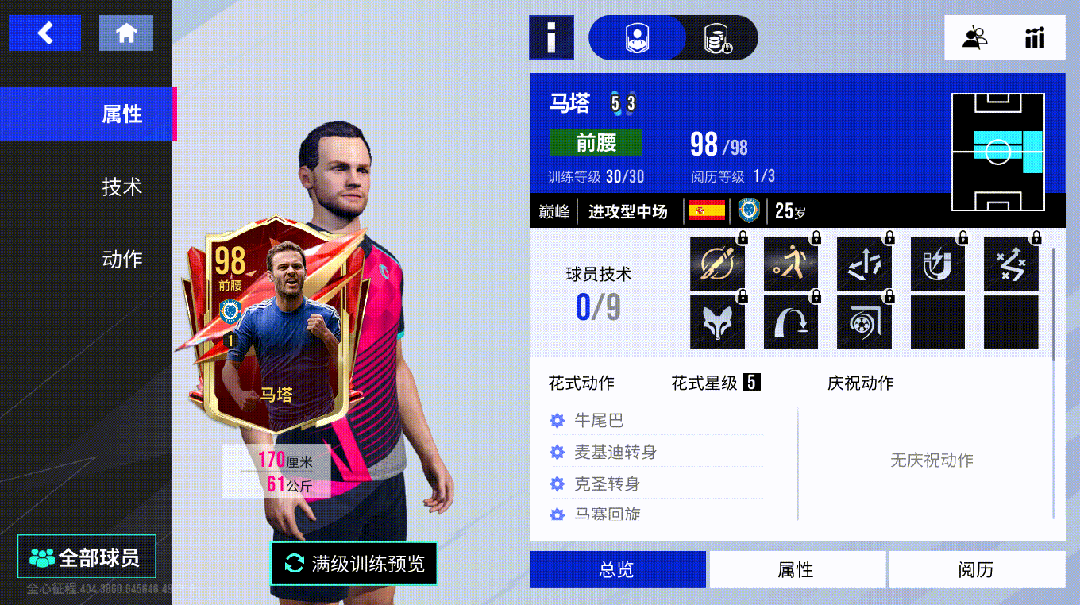 在绿茵场上,马塔就是那台精密且火力全开的进攻 “引擎”。作为前腰,脚下活儿细腻得如同在草皮上绣花,技术精湛只是基本操作,那创造力更是天马行空,分分钟 “撕裂” 对手防线,策划出致命一击。他的传与射,恰似一对 “黄金搭档”,配合得炉火纯青。此外,盘带更是马塔的拿手好戏,一个急停、加速,防守球员就被晃得晕头转向,只能目送他潇洒突破。马塔进攻端无短板的特点也真实反映在了他的球员属性中——其射门、带球、控球、长传和短传各项数值齐“破百”,堪称进攻端无敌的存在!