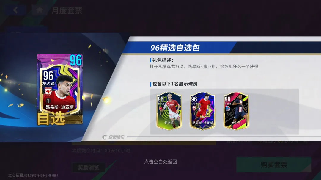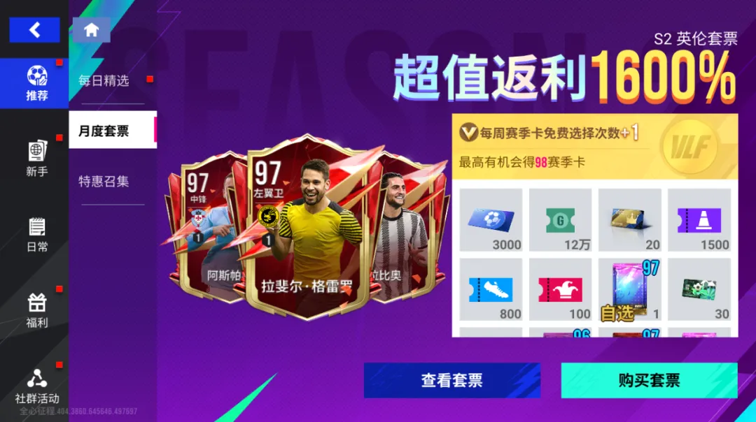 12月1日,S2赛季「英格兰联赛」开启后,月度套票将新增【赛季卡选择次数+1】权益,经理在新版月度套票,可额外在「赛季卡·候选」中多选择一名心仪的火热卡候选球员!同时,月度套票任务奖励进行了调整优化,最终免费大奖可获得96潜力「精选福利自选包」、付费大奖可获得97潜力「巅峰福利自选包」